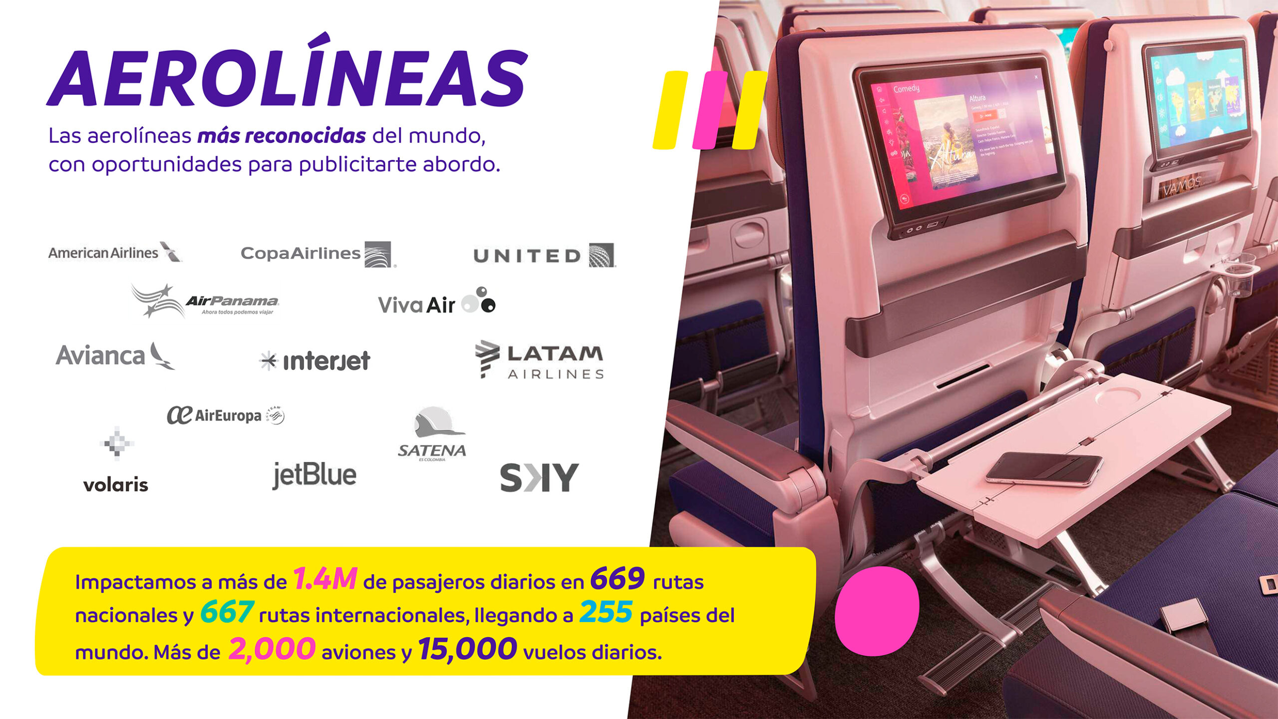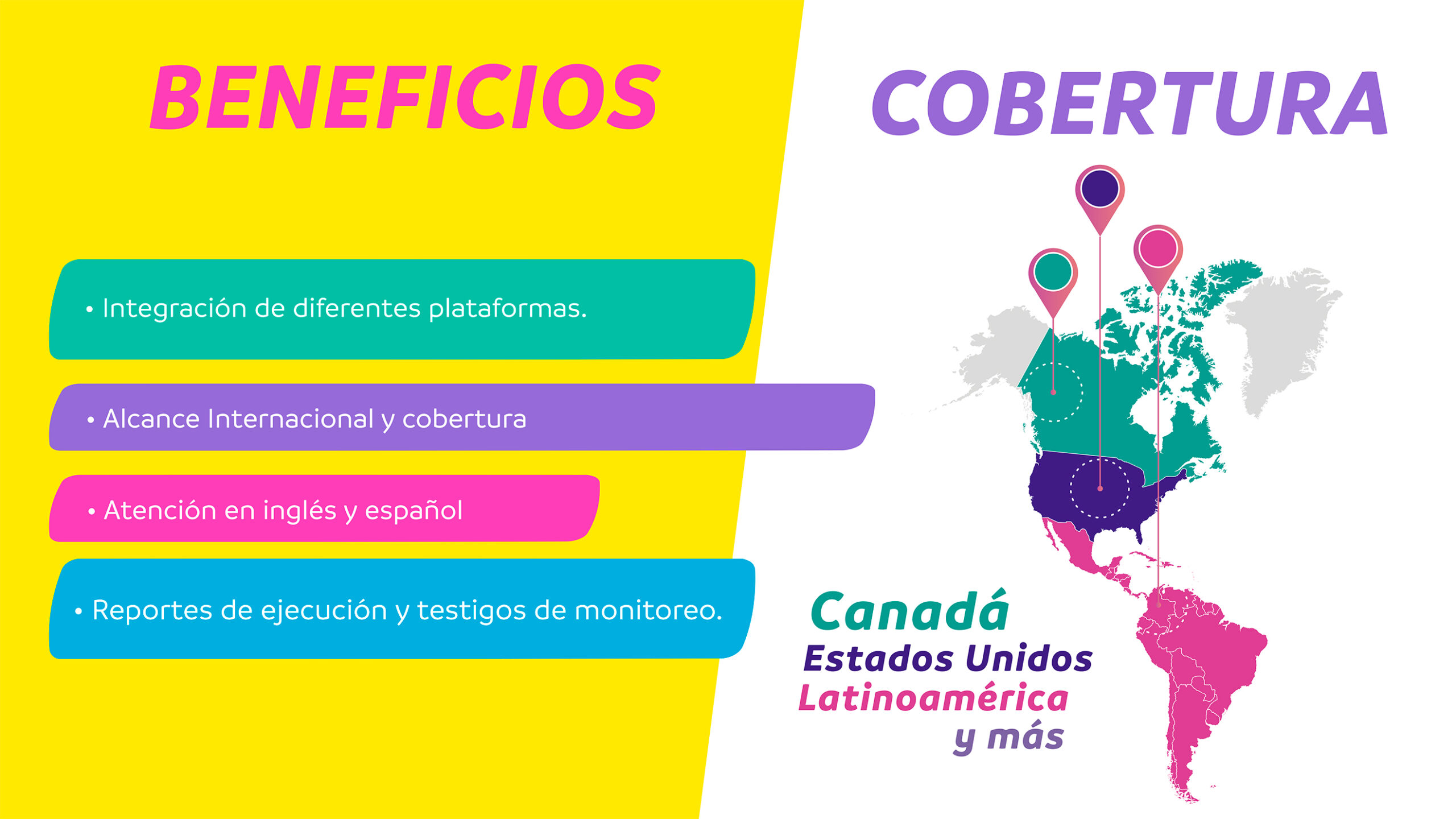 Amplio Alcance Global: Nuestra red de medios incluye pantallas publicitarias en aeropuertos y presencia en eventos deportivos como la NBA y la NFL, logrando impacto global.
